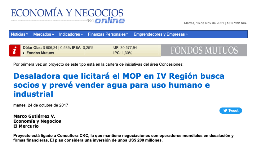 Proyecto está ligado a Consultora CKC, la que mantiene negociaciones con operadores mundiales en desalación y firmas financieras. El plan considera una inversión de unos US$ 200 millones.